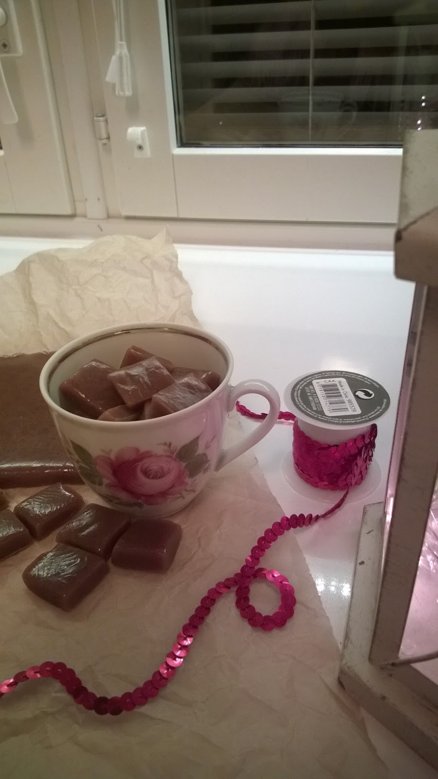 Kaada seos leivinpaperilla vuorattuun vuokaan (n. 20cmx25cm). Anna jäähtyä huoneenlämmössä. Leikkaa toffee n. 2-3 cm:n paloiksi. Kääri toffeet leivinpaperiin. Säilytä jääkaapissa.